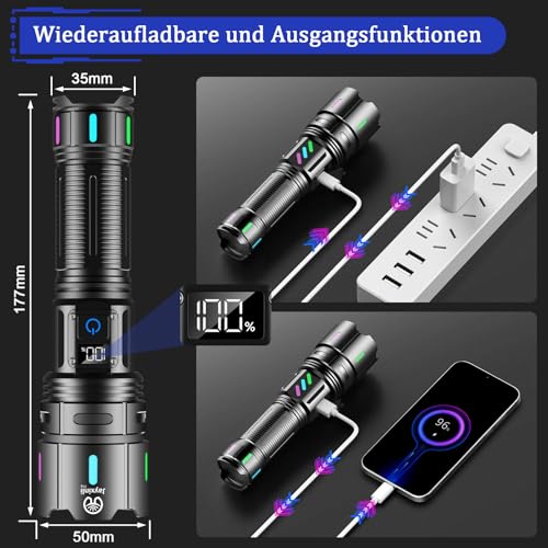 - BATTERIE HAUTE CAPACITÉ & AFFICHAGE LCD DE LA PUISSANCE: Lampe poche USB rechargeable, Avec batterie rechargeable de haute capacité 5000mA, Fournit jusqu’à 12 heures de luminosité (Mode bas). Port de charge Type-C intégré, Chargement plus pratique. Port USB intégré pour charger les téléphones portables, les écouteurs, etc. en cas d’urgence. Écran LCD innovant, Affichage précis du pourcentage de batterie restante