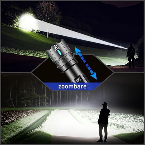 - LAMPE TORCHE LED ULTRA PUISSANTE 1000000 LUMENS: Lampe torche LED ultra puissante rechargeable, Équipé d’une puce XHM99.2 puissante et améliorée et de perles de lampe de haute qualité, Il présente les avantages d’une grande luminosité, d’une longue portée et d’une forte pénétration, Il fournit une lumière stable, uniforme, brillante et durable. Luminosité jusqu’à 1,000,000 lumens en mode haute luminosité, zone d’irradiation jusqu’à 260 mètres carrés, distance maximale du faisceau de 1500 mètres, adaptée à toutes les conditions de faible visibilité, telles que la pluie, le brouillard, les pannes d’électricité et autres situations d’urgence