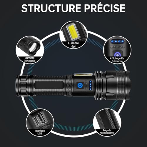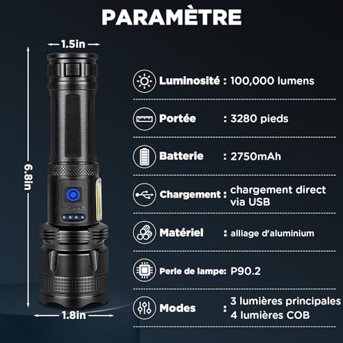 - Lampe Torche 500000 Lumens– La lampe de poche rechargeable de 500000 lumens est une lampe torche puissante avec 7 modes d’éclairage. La lampe de poche LED peut éclairer jusqu’à 3280 pieds maximum, et la durée de vie est supérieure à 120 000 heures. Convient pour le camping, la randonnée, la course de nuit, la pêche, l’escalade, la chasse et d’autres activités de plein air